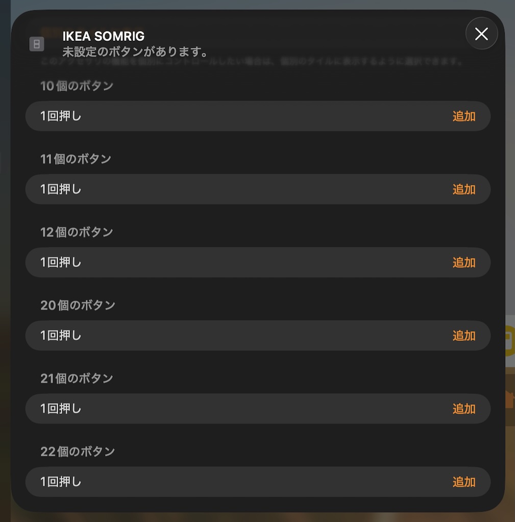 Zigbee2MQTTに追加するのとほぼ同時に、iPhoneやMacのホーム.appにもボタンが自動的に表示されます。z2mプラグインのおかげです。デフォルトではZigbeeのIDで表示されますが、以下ではSOMRIGと改名してあります。