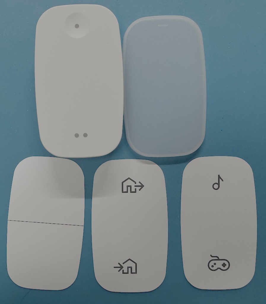 表示シートは3枚入っています。本体の上にシートを載せて、半透明カバーをするとスイッチの表示を変えられます。シートの裏表には、「外出・帰宅」「朝・夜」などのシーンに対応したアイコンが印刷されています。