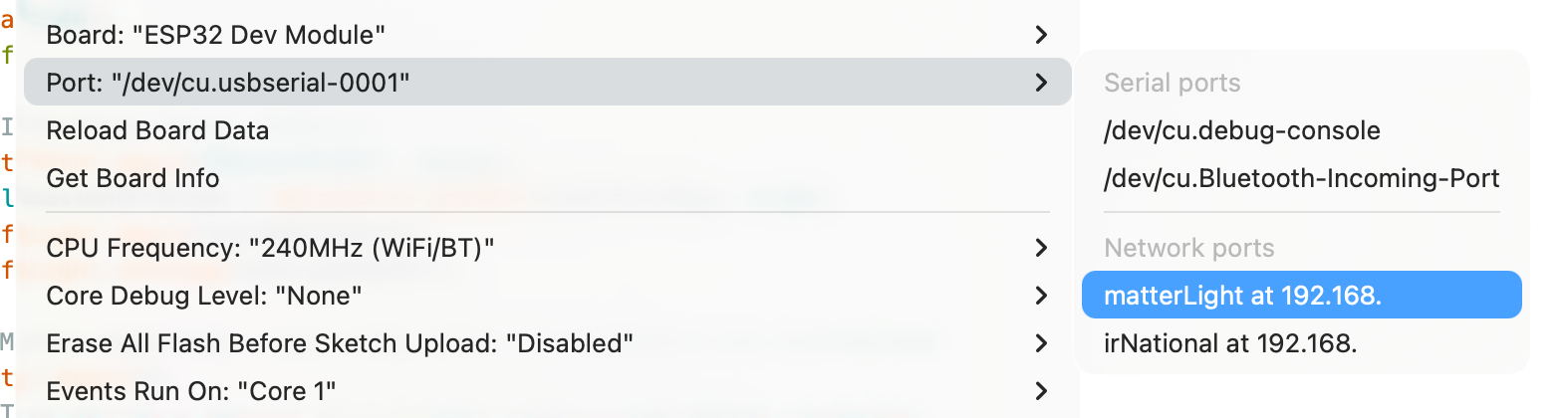 OTAの動作確認をしました。このプログラムを、まずは有線でアップロードして動作させます。するとArduino IDEのポートのメニューに、WiFi接続先が現れます。下図では、プログラム内で指定したmatterLightという名前で表れています。